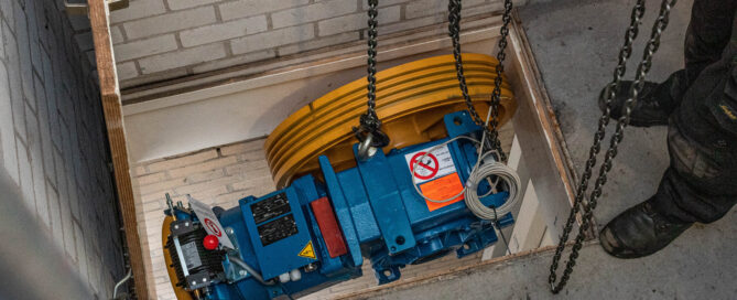 Door slijtage aan de liftmachine, staalkabels en tractieschijf werd er besloten om de gehele aandrijving te vervangen.